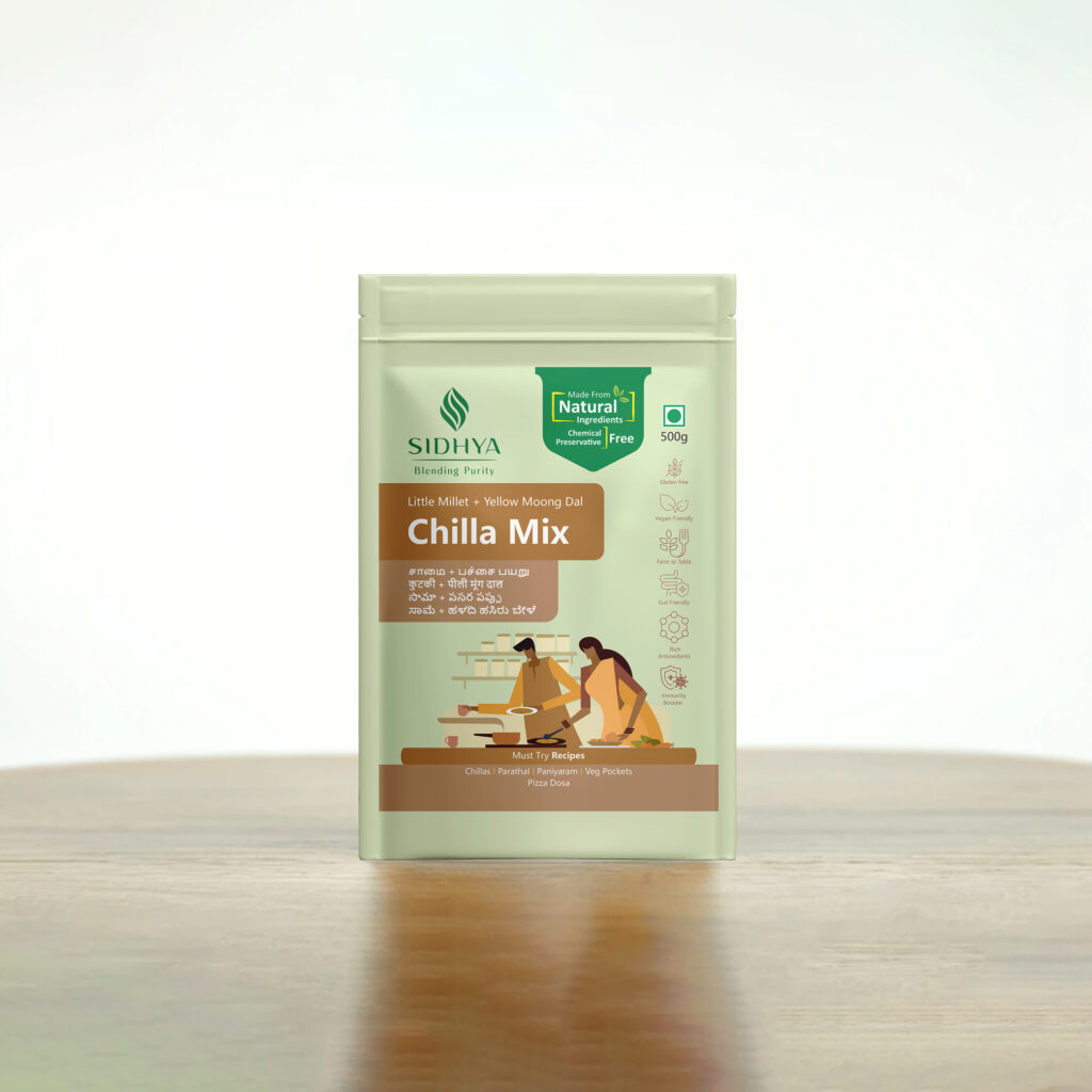 Sidhya Little Millet + Yellow Moong Dal Chilla Mix is a wholesome, protein-rich mix made with nutrient-dense little millet and yellow moong dal. It is free from artificial colours or flavours, excess heavy metals, pesticide residues, and harmful toxins, with label accuracy verified.